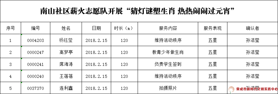 | 序号 | 编号 | 姓名 | 活动 | 签到时间 | 签退时间 | 服务时长 | 确认人 | 服务表现 |