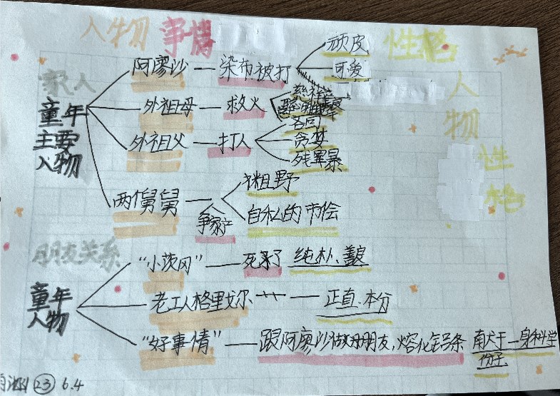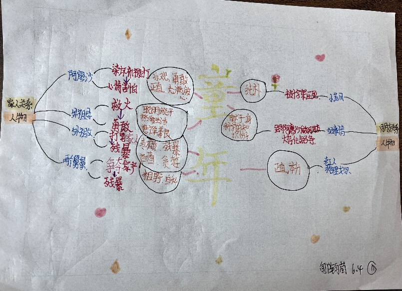 文字的力量是巨大的。同学们在读完《童年》后,根据自己的读书进度,尝试用思维导图梳理《童年》的故事情节。孩子们首先选择自己印象深刻的章节精读,然后讨论概括关键词,形成初稿,最后形成了一幅幅形象直观的思维导图。