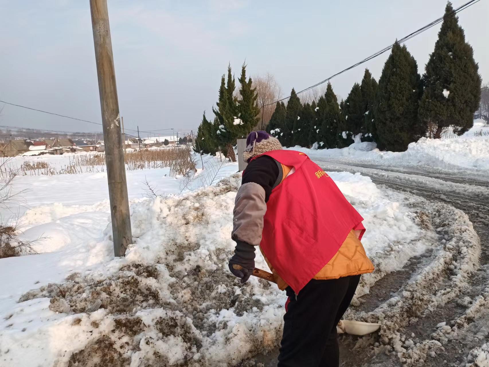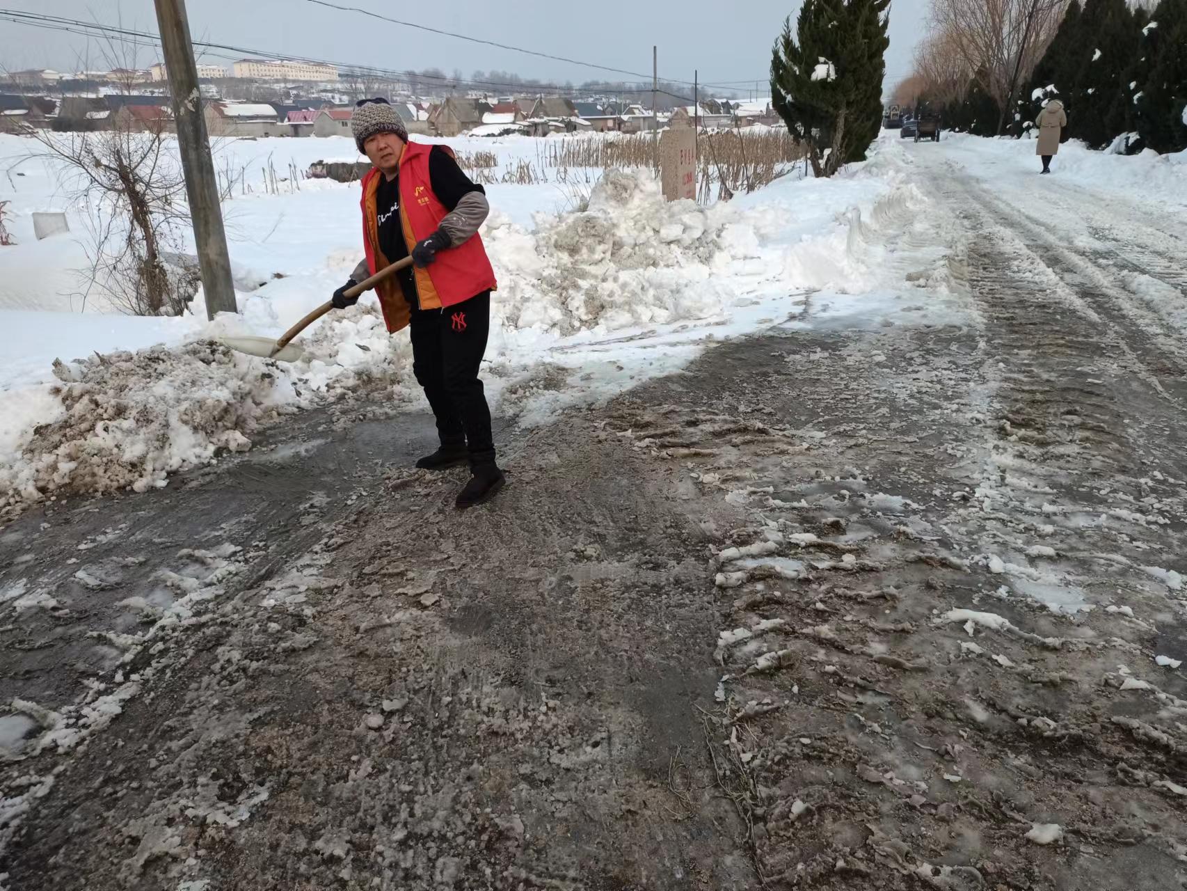 雪后的道路虽然已撒融雪剂,但是路口处积雪还是较厚,影响车辆通行,为方便村民出入,俚岛镇西利查埠村志愿服务队于2023年12月27日09:00-10:00招募2名志愿者开展清理路口积雪志愿活动。