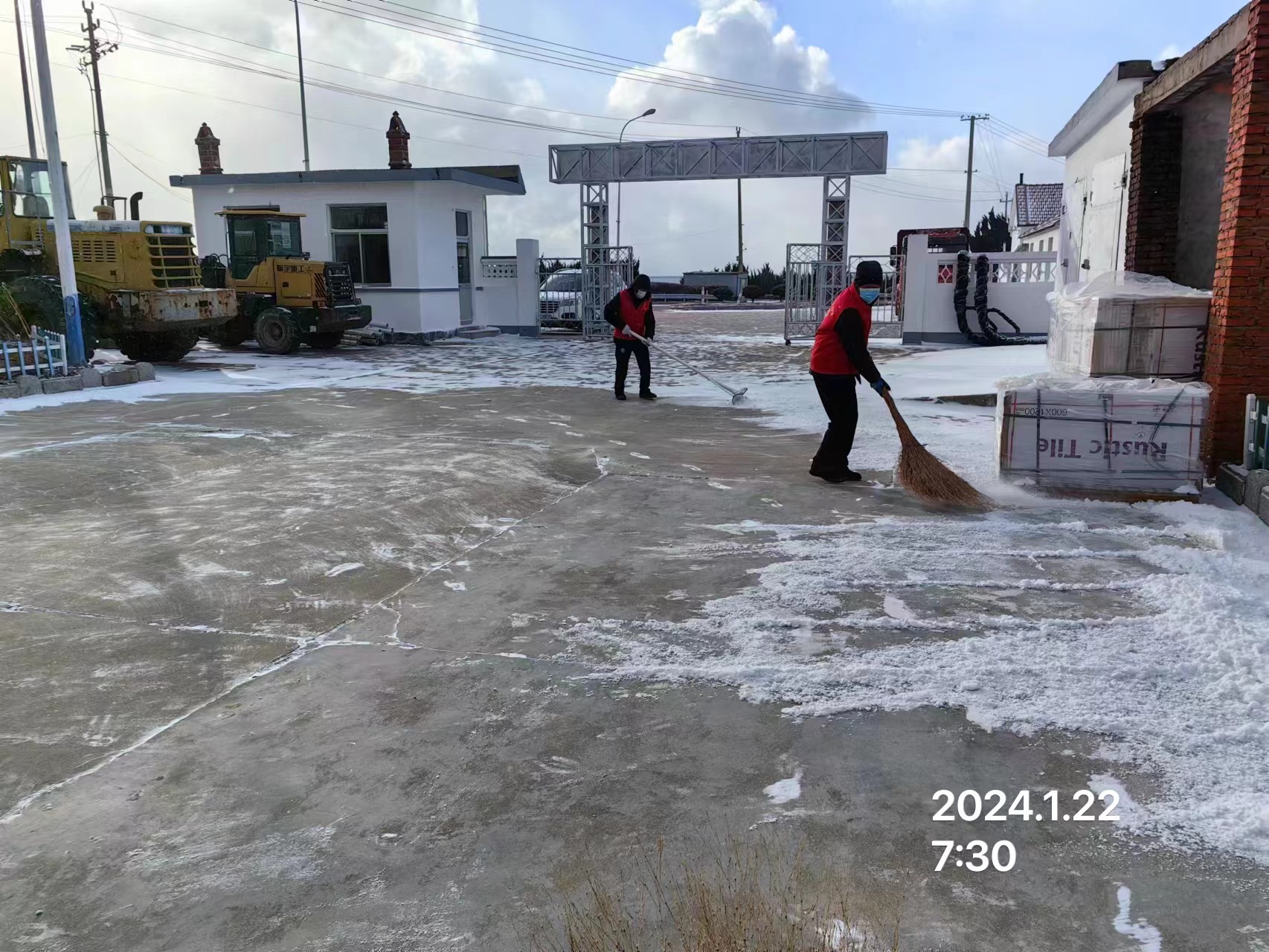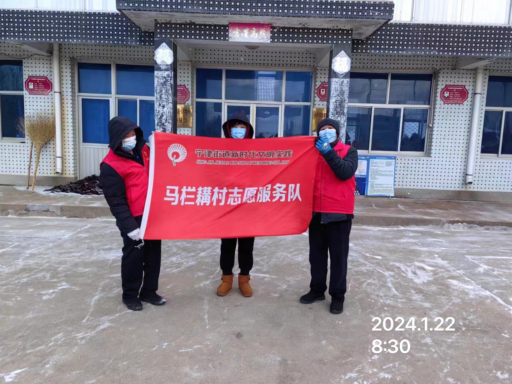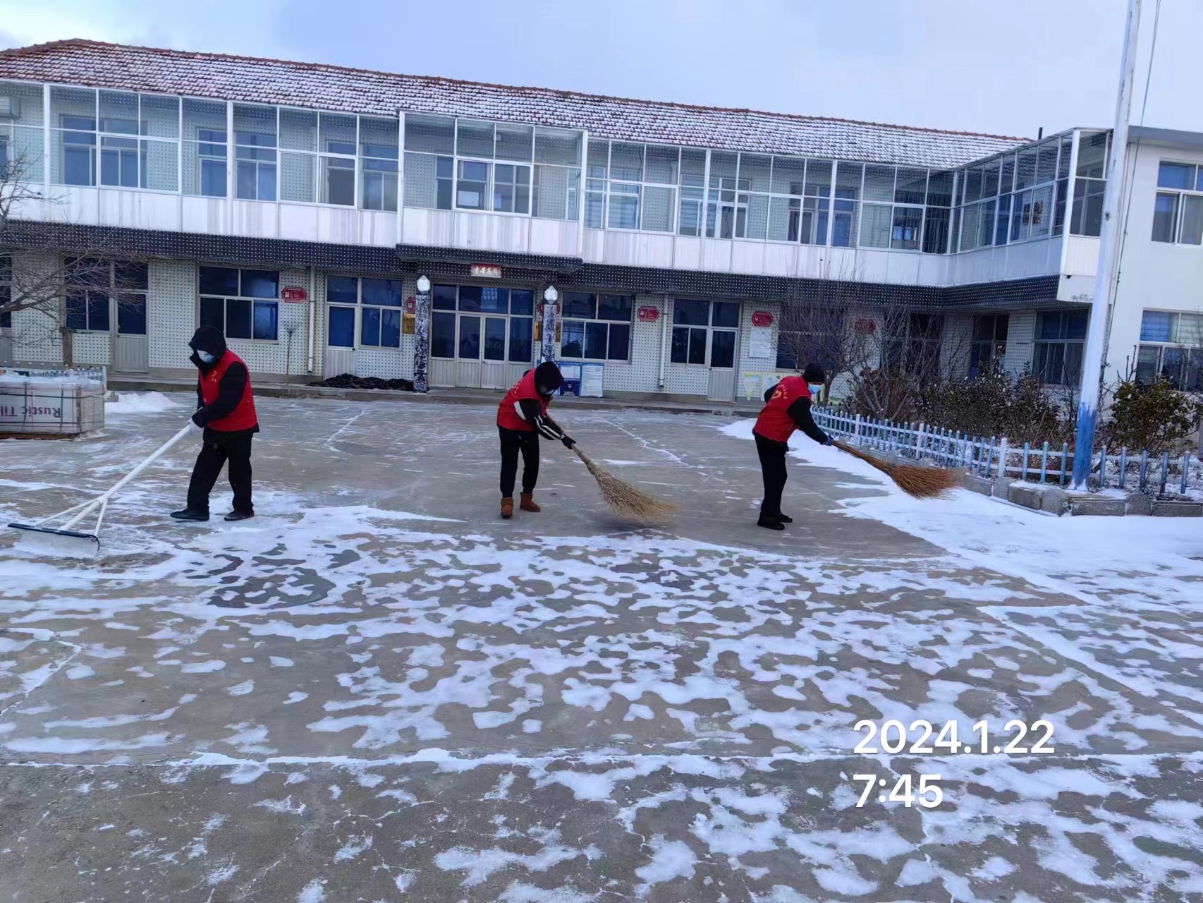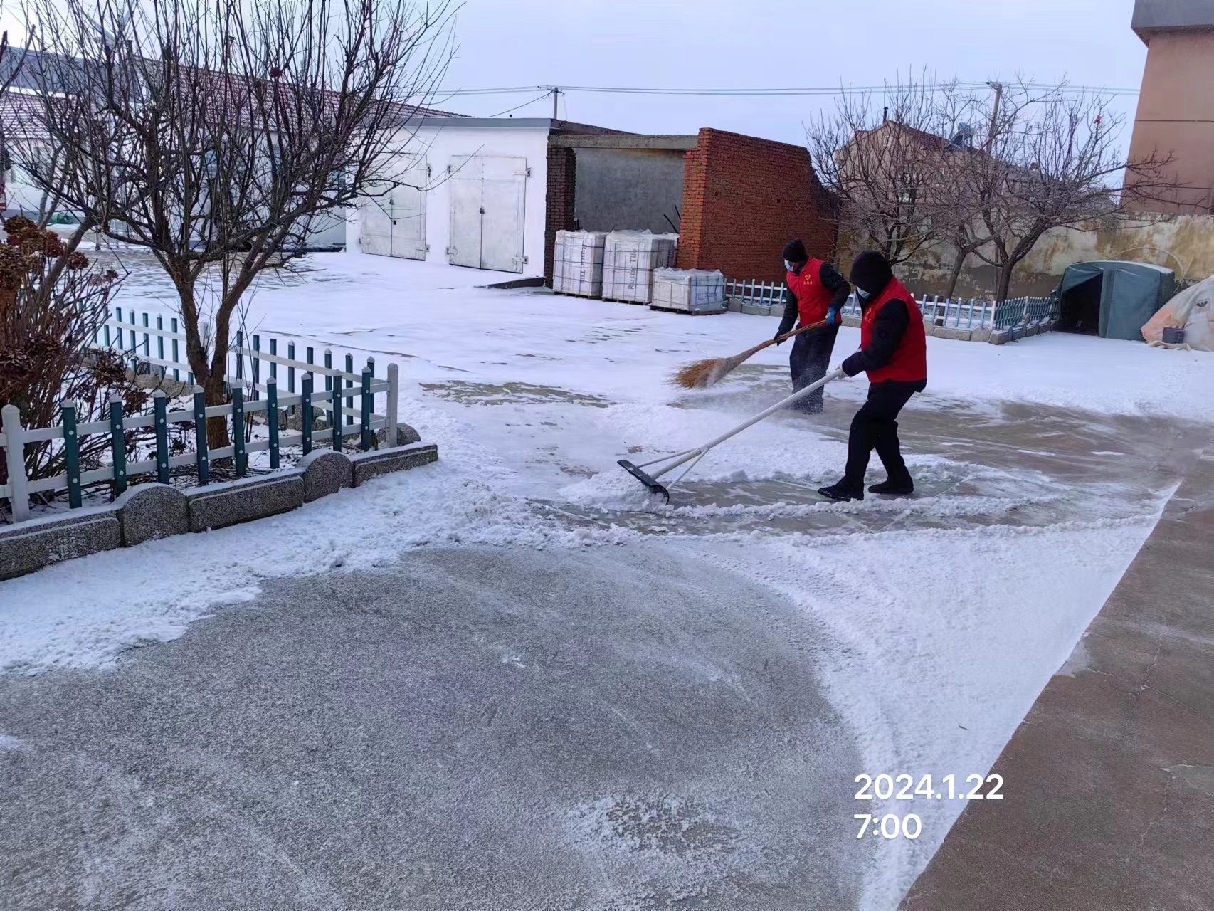 宁津街道马栏耩村志愿服务队于2024年1月23日早上7:00—8:30,招募3名志愿者清扫村委大院及广场的积雪,旨在通过此次活动,清除道路的积雪,为村民出行排除隐患,保障安全出行。