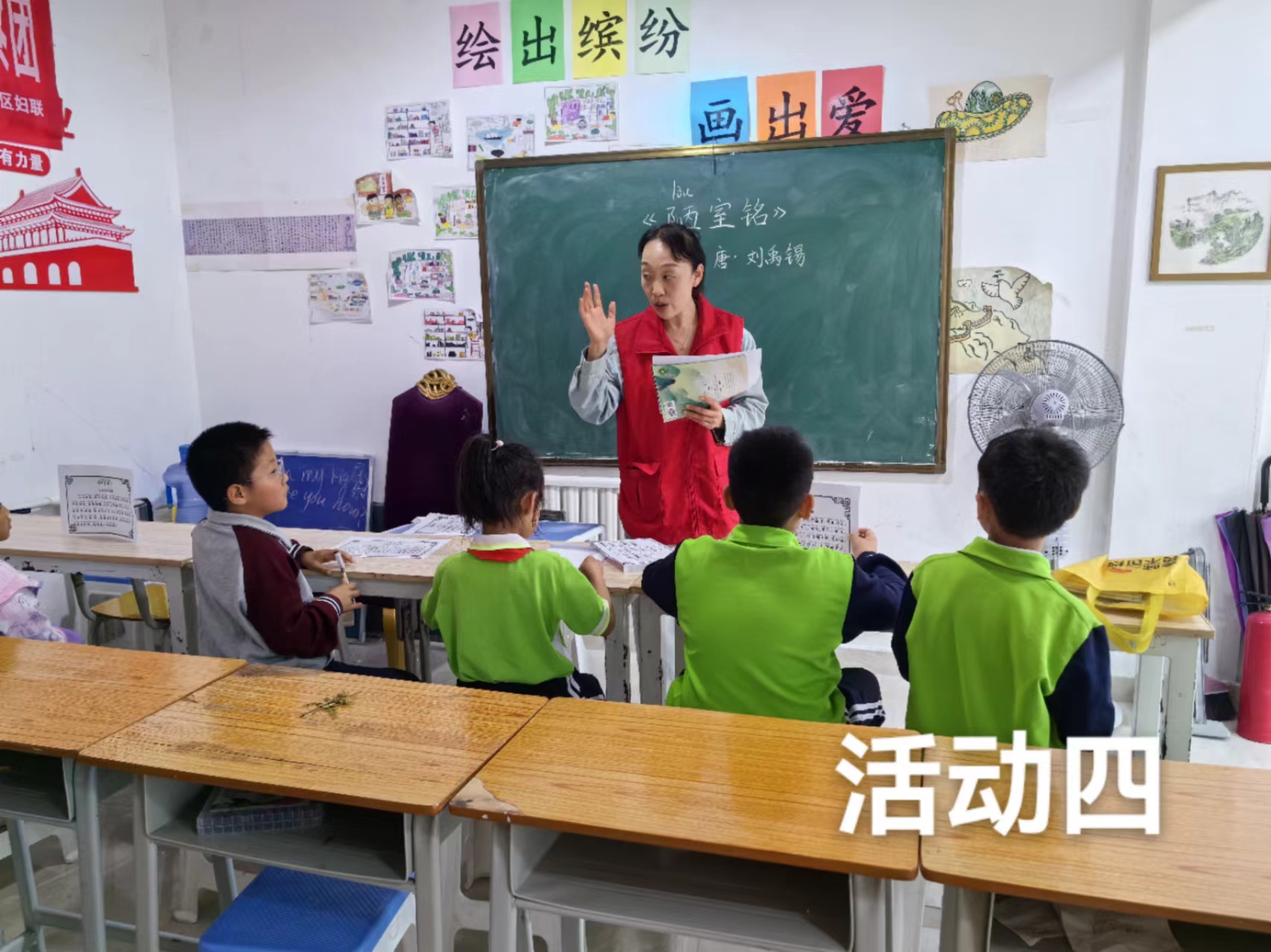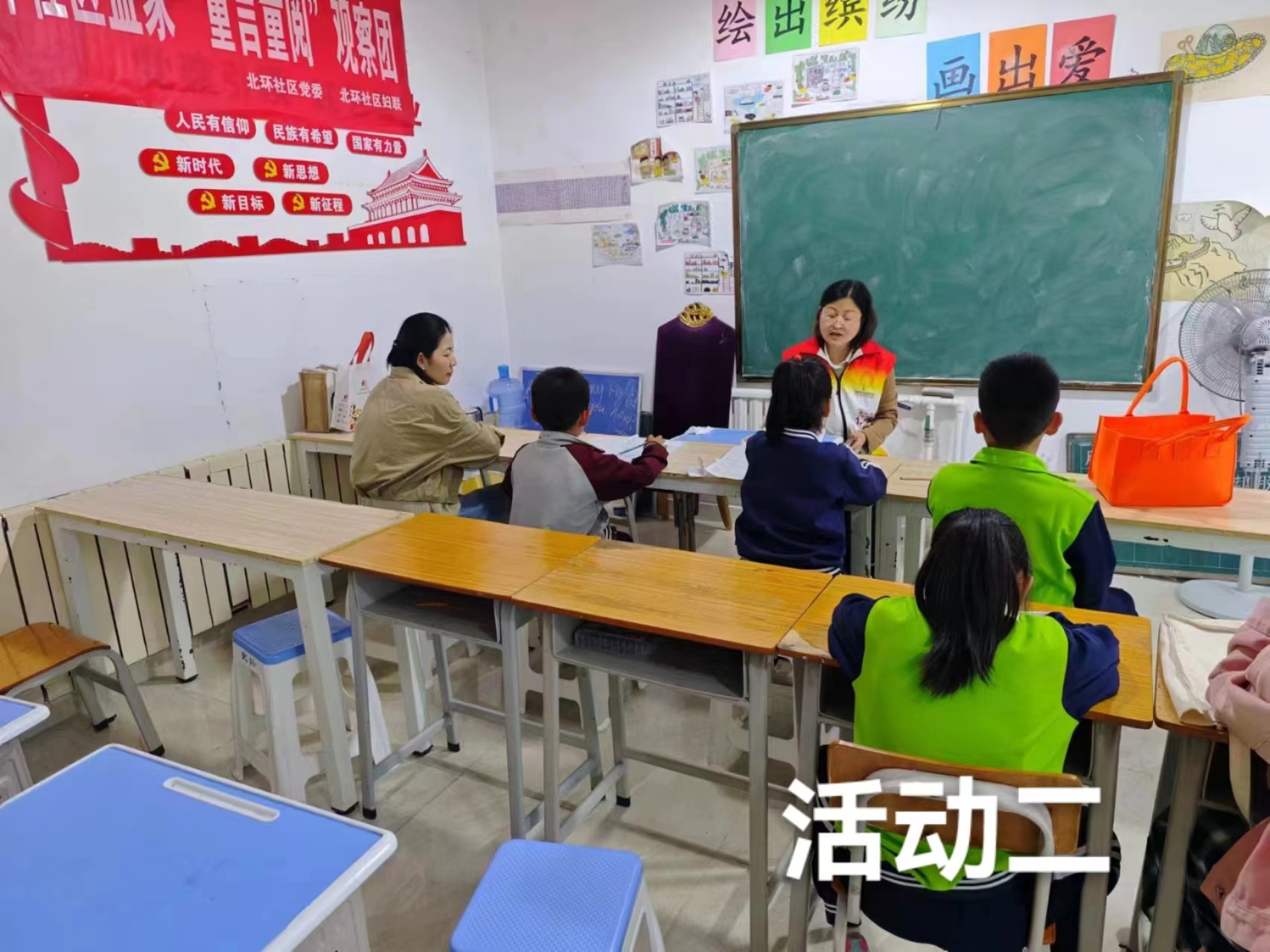 志愿者分工:1名拍照,维持秩序,签到。1名老师负责维持课堂秩序给孩子们上课,讲解、传授社区孩子们经典知识。并激发了孩子们的学习热情。志愿者分工:1名拍照,维持课堂秩序。1名老师负责给孩子们上课,讲解、传授社区孩子们古诗词知识。