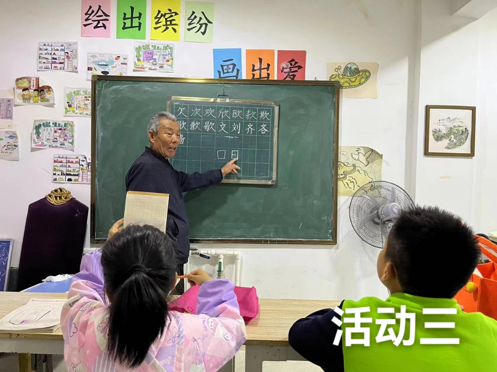 本节课由教学经验丰富、具有较高书法造诣的退休教师高老师带领学生们学习汉字。高老师先强调了练习汉字时的注意事项:写字时要用田字格,一笔一划写,开始练习生字时,不能图快,要先观察每个字的结构,每个笔画的位置,等熟练定型以后再加快速度。主要讲了欠、次、欢、欣、欧、款、欺、歌、歉、歇、文、刘、齐、吝、啬等汉字的意思,分析了汉字的组成结构、笔画的特征及写字时应该注意的问题。然后让学生们进行练习,练习过程中,老师逐个为孩子们指导,注意改正平日写字时出现的问题,纠正孩子们的坐姿和握笔姿势。学生们书写认真,练习很投入。
