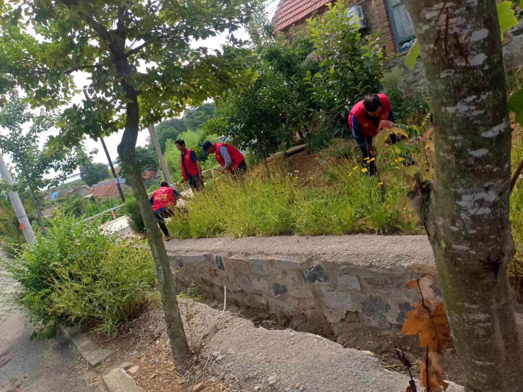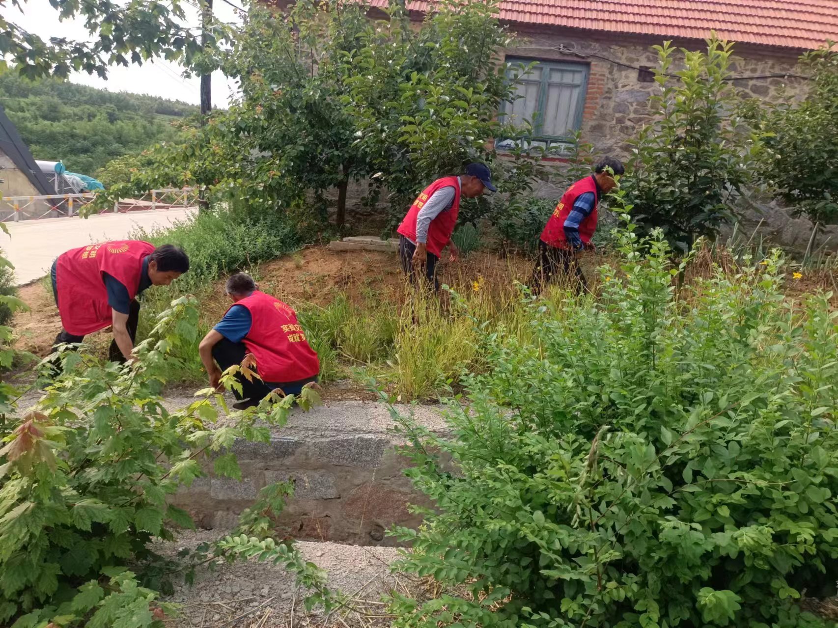王连街道赵家山村7.1日“党旗红”志愿服务队利用庆祝党的生日开展清理垃圾卫生和花地杂草活动