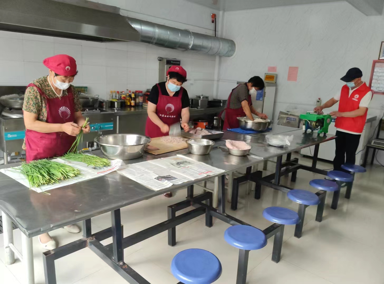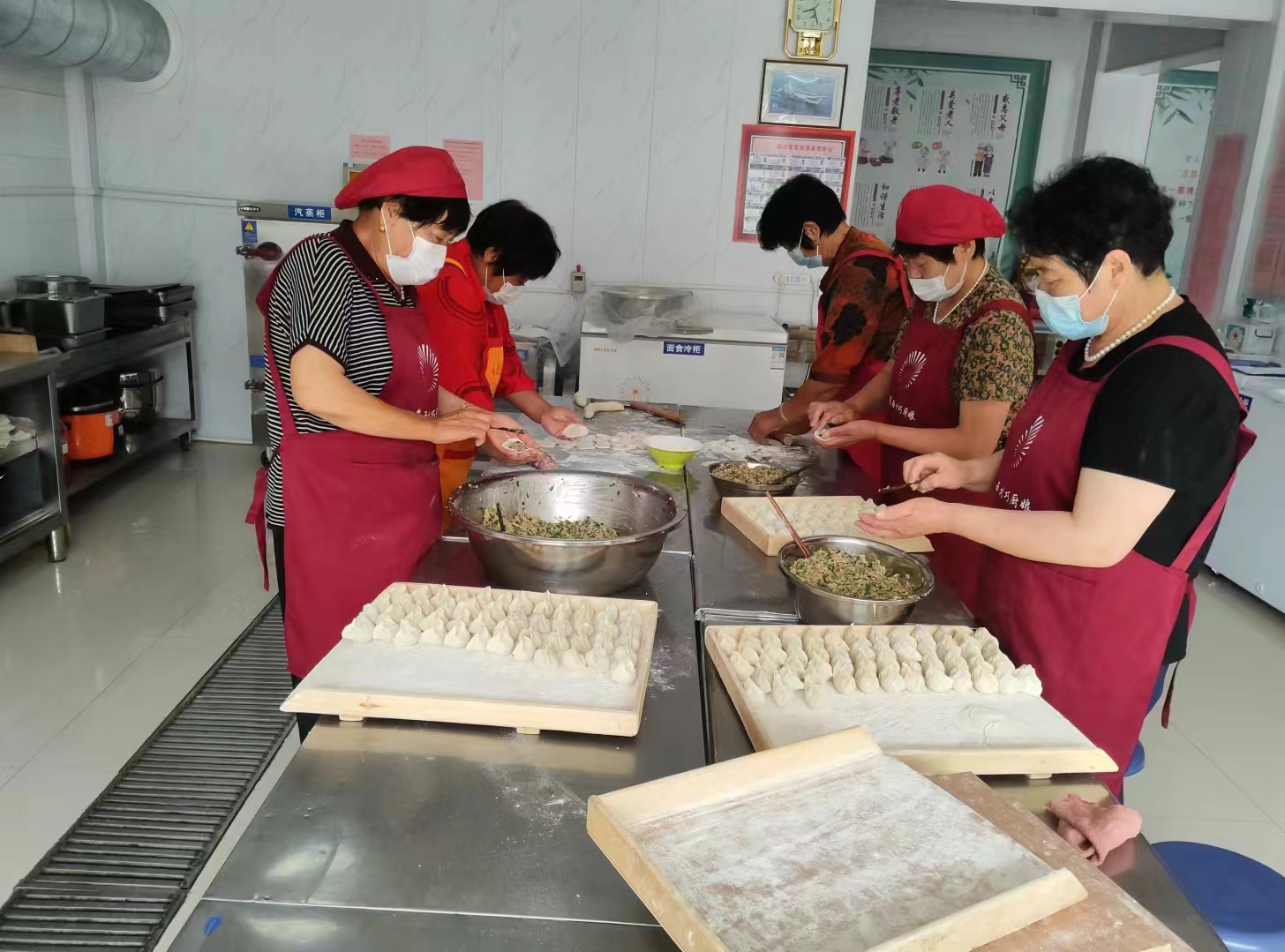 北崖西村志愿服务队于2024年7月15日7:30-11:00 8名志愿者在暖心食堂开展志愿服务活动,给44位就餐老人准备爱心午餐,志愿者们分工明确,和面、压面,洗、剁小红萝卜丝,洗、擦丝、剁茭瓜,择、洗、切韭菜,餐前活动公布今天捐赠人员名单,志愿者和就餐老人们一起做拍手健康操,分餐、餐后洗刷餐盘收拾卫生等志愿活动。