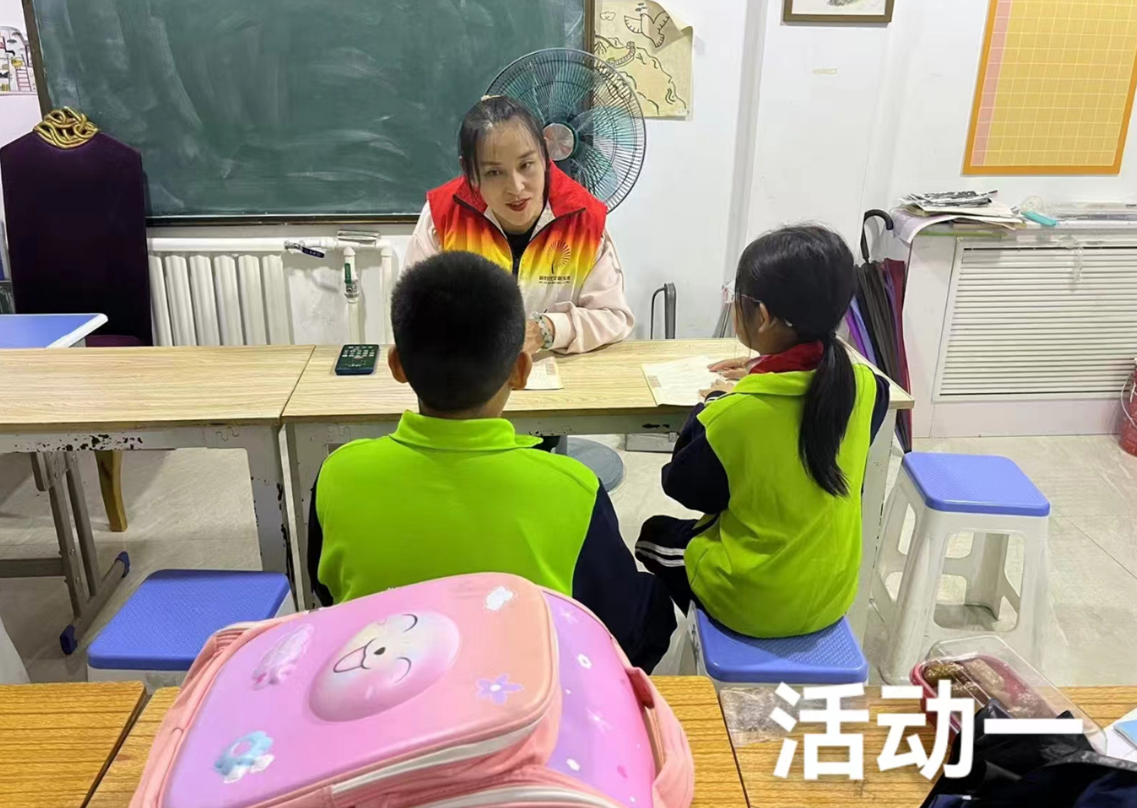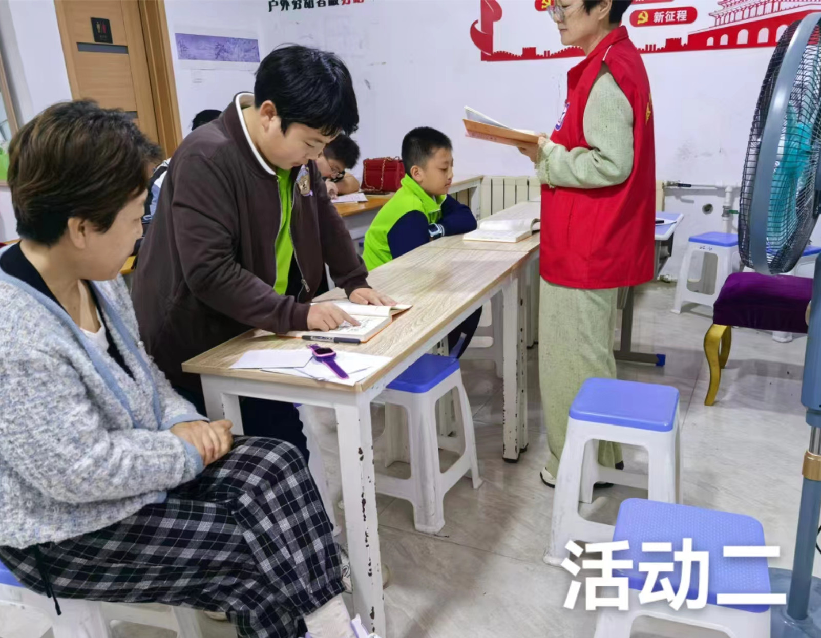 志愿者分工:1名老师负责给孩子们上课,讲解传授社区孩子们古文知识;1名老师拍照,维持课堂秩序。