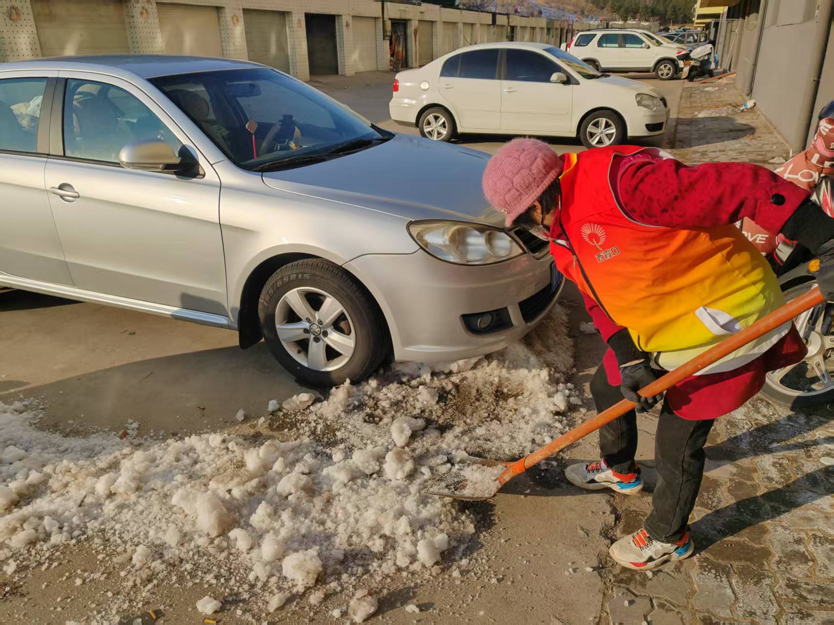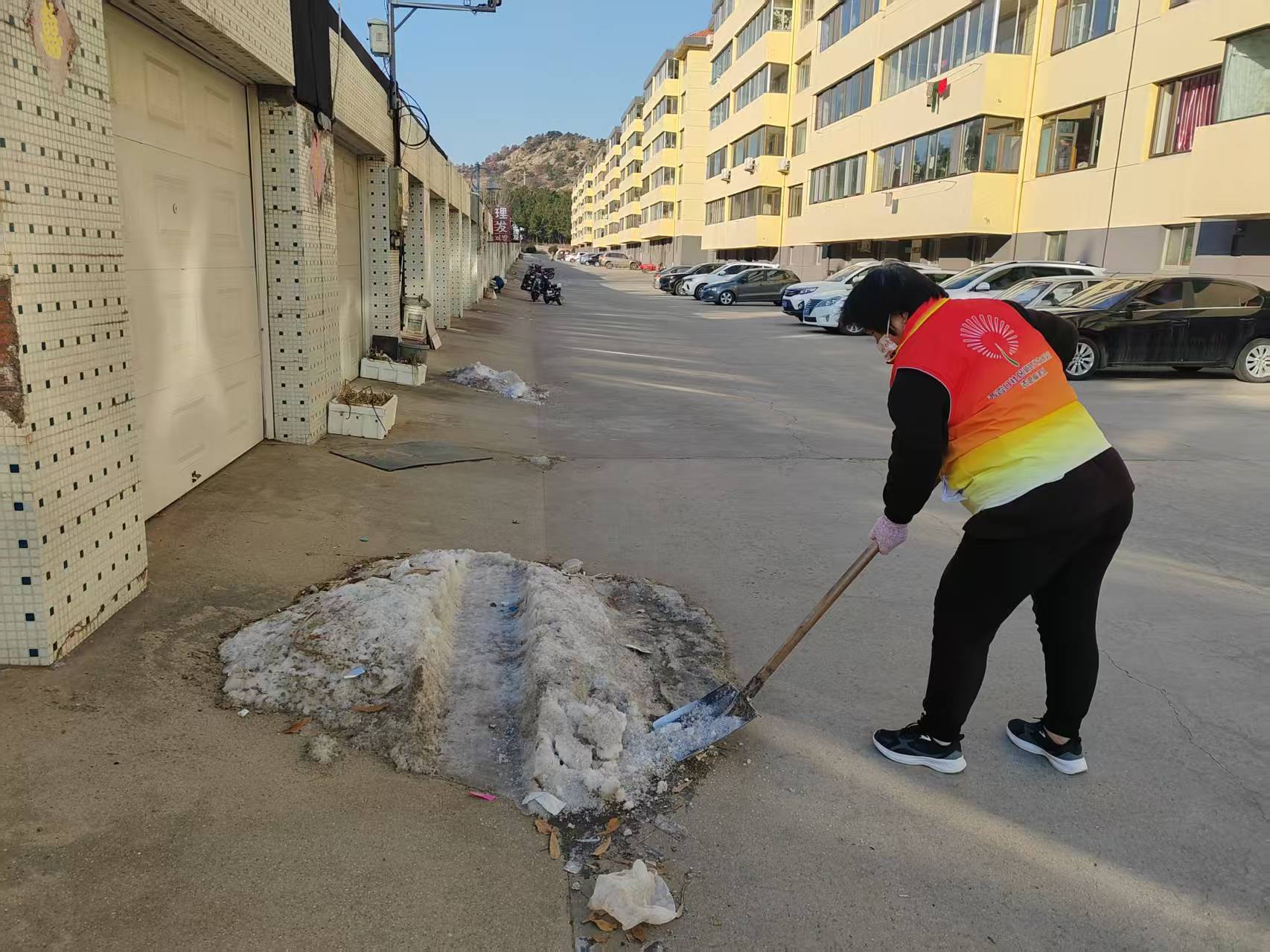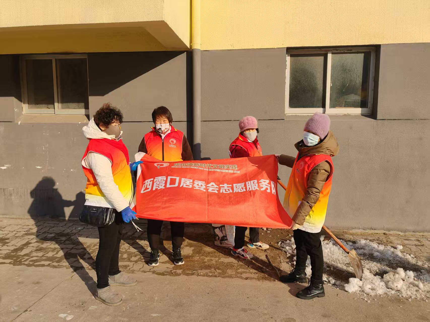 成山镇西霞口社区志愿服务队2月10日组织志愿者开展社区积雪清理志愿活动