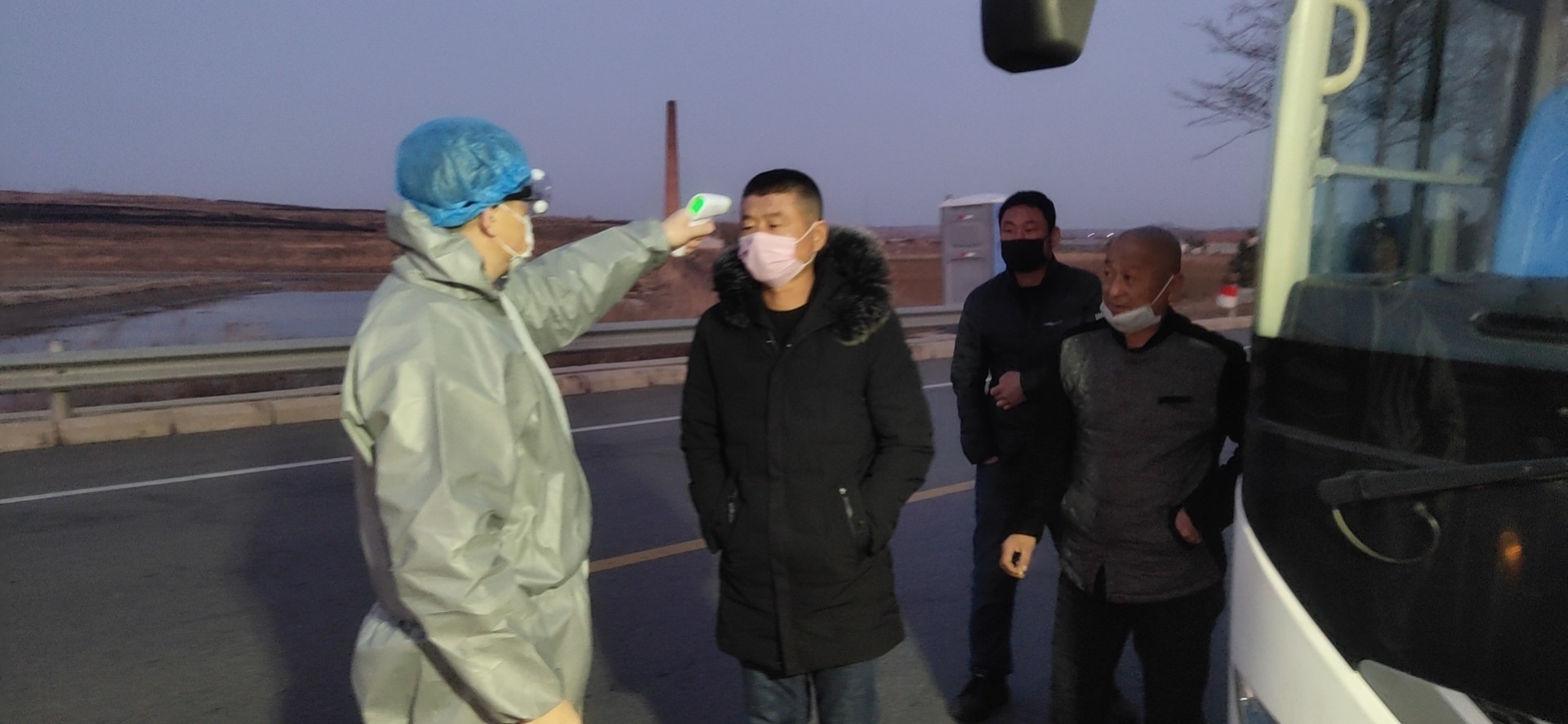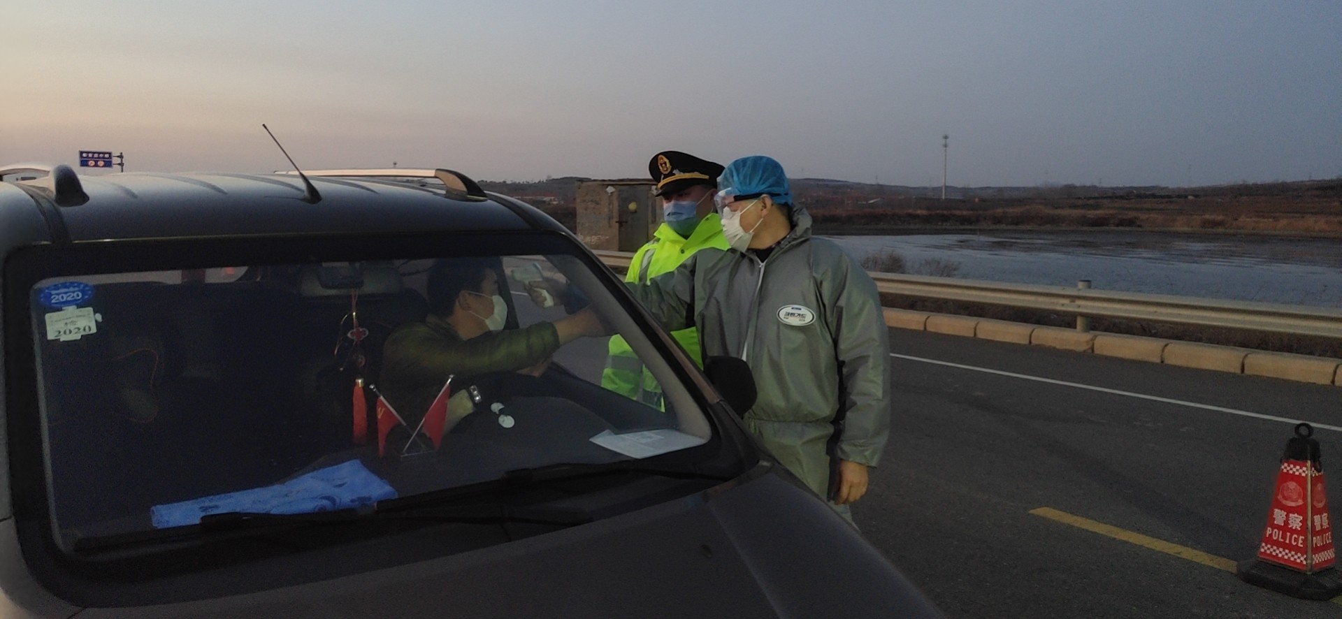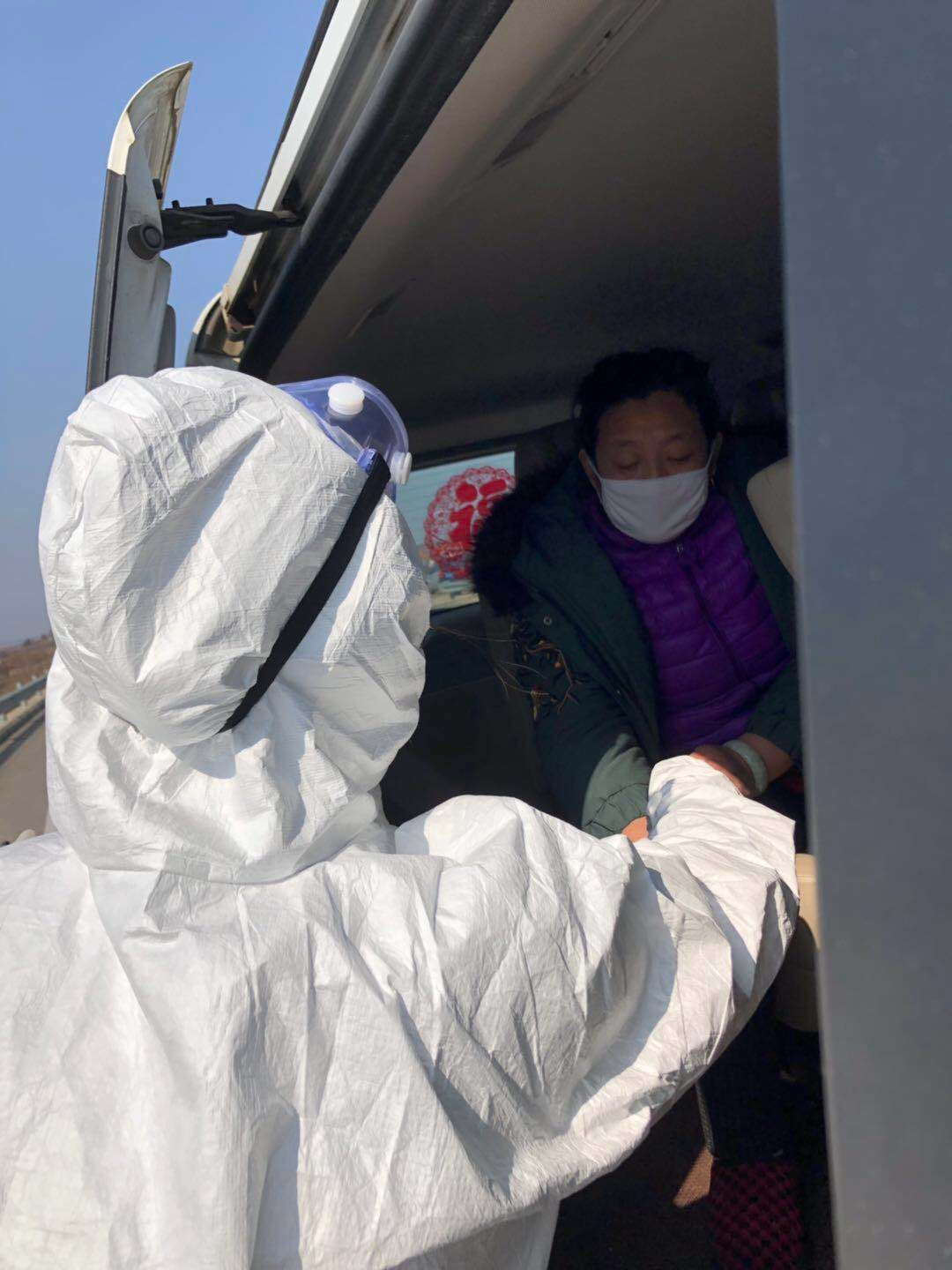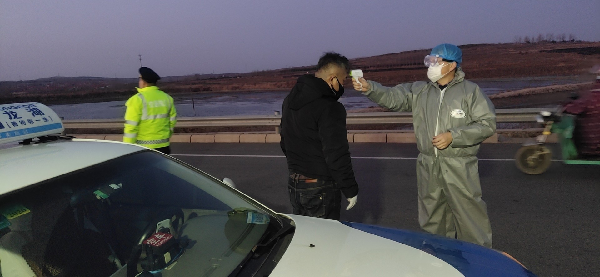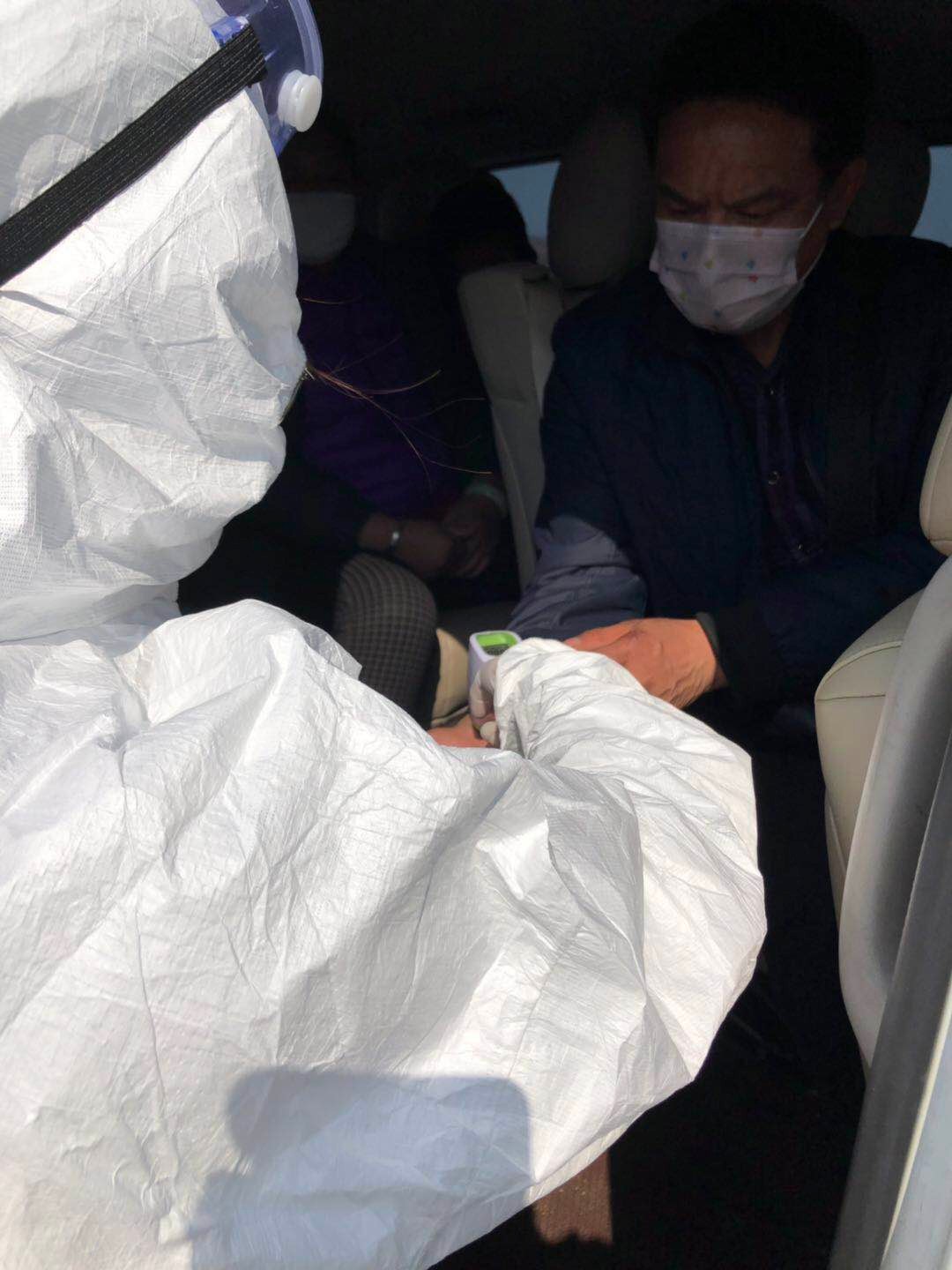 名医务人员到上庄蔡官屯卡点对来往人员进行体温检测。