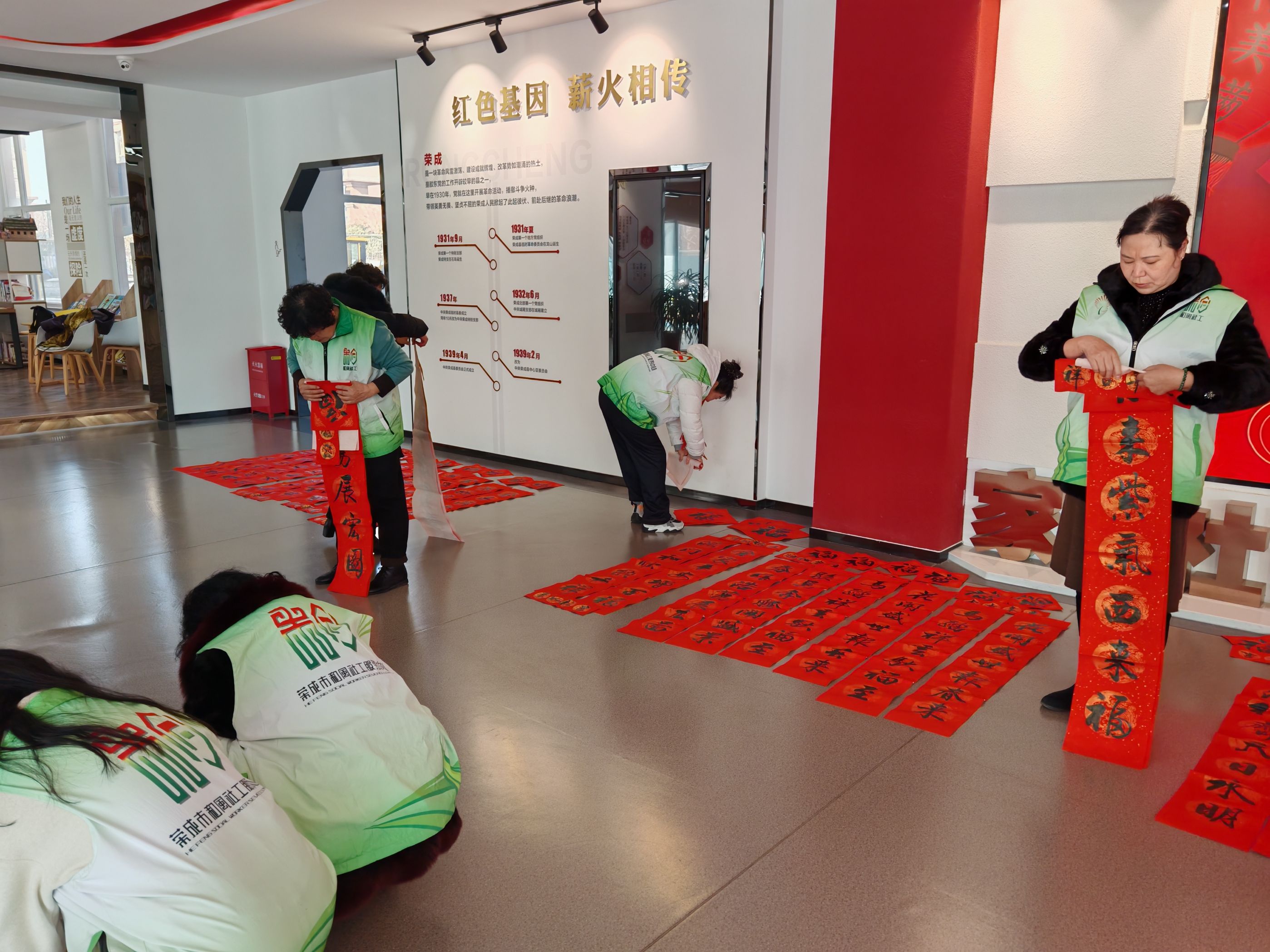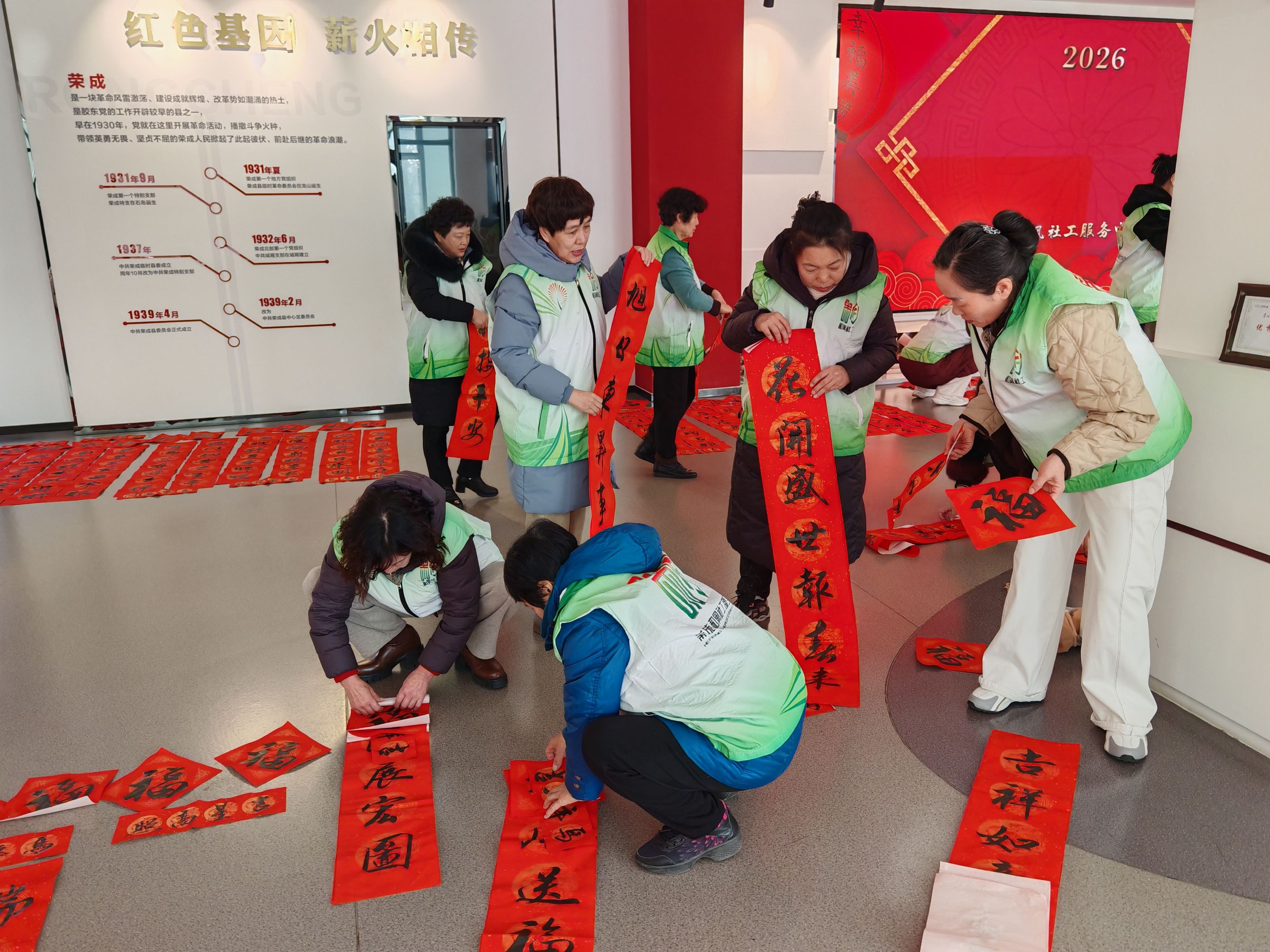 为了让传统年俗焕发时代活力,让文明新风浸润百姓心田,2月4日和风社会工作服务中心组织社区5名书法老师及5位和风志愿者骨干,在荣成市社会组织孵化园开展迎春送福写春联活动,以笔墨传温暖,用行动践美德。志愿者协助书法老师铺纸、晾晒、分发春联,更将饱含心意的作品精心打包,计划送往社区高龄老人与特殊家庭,让新春关怀覆盖每一个需要关注的角落。