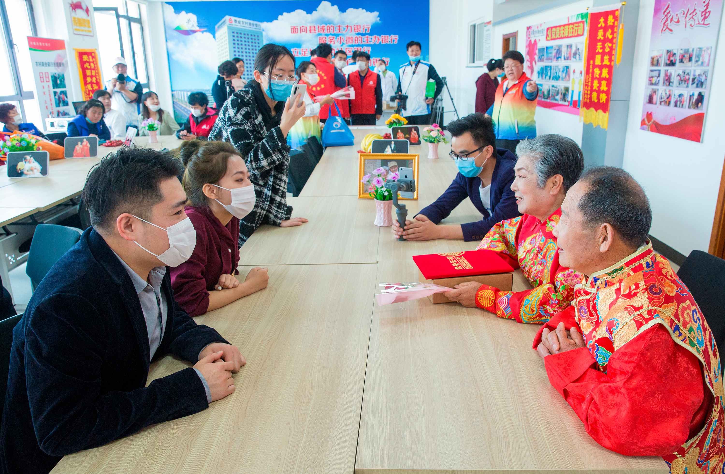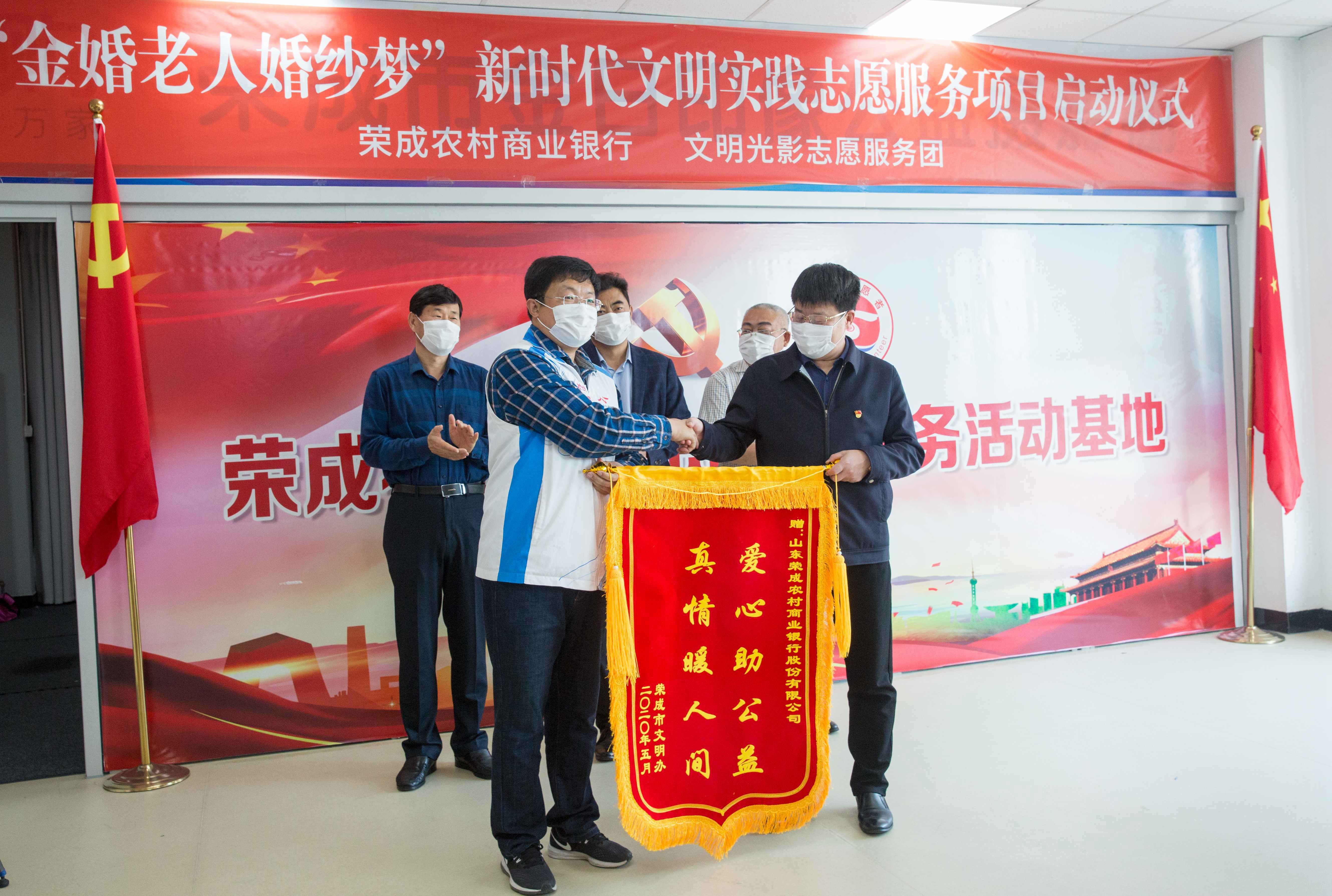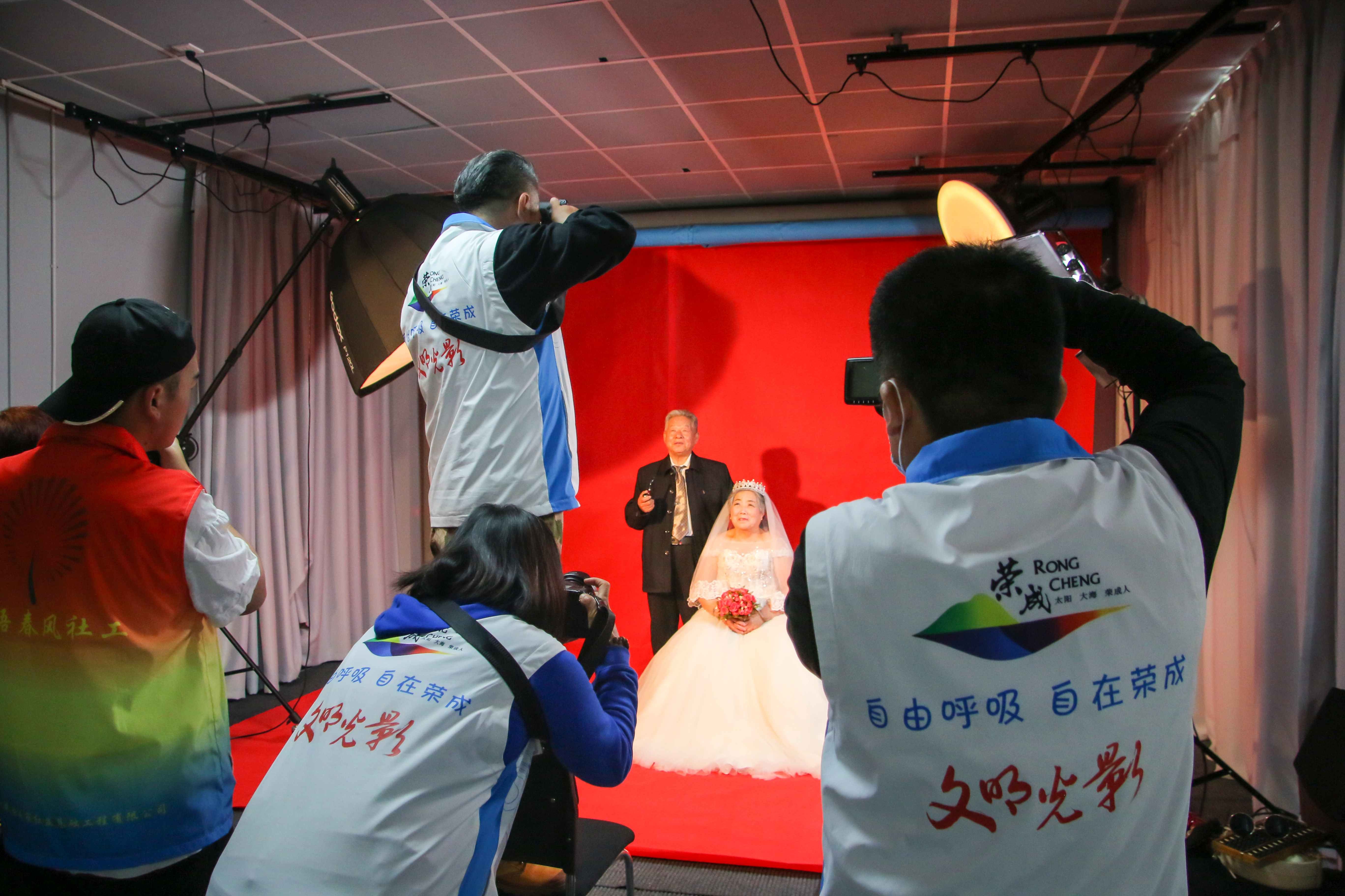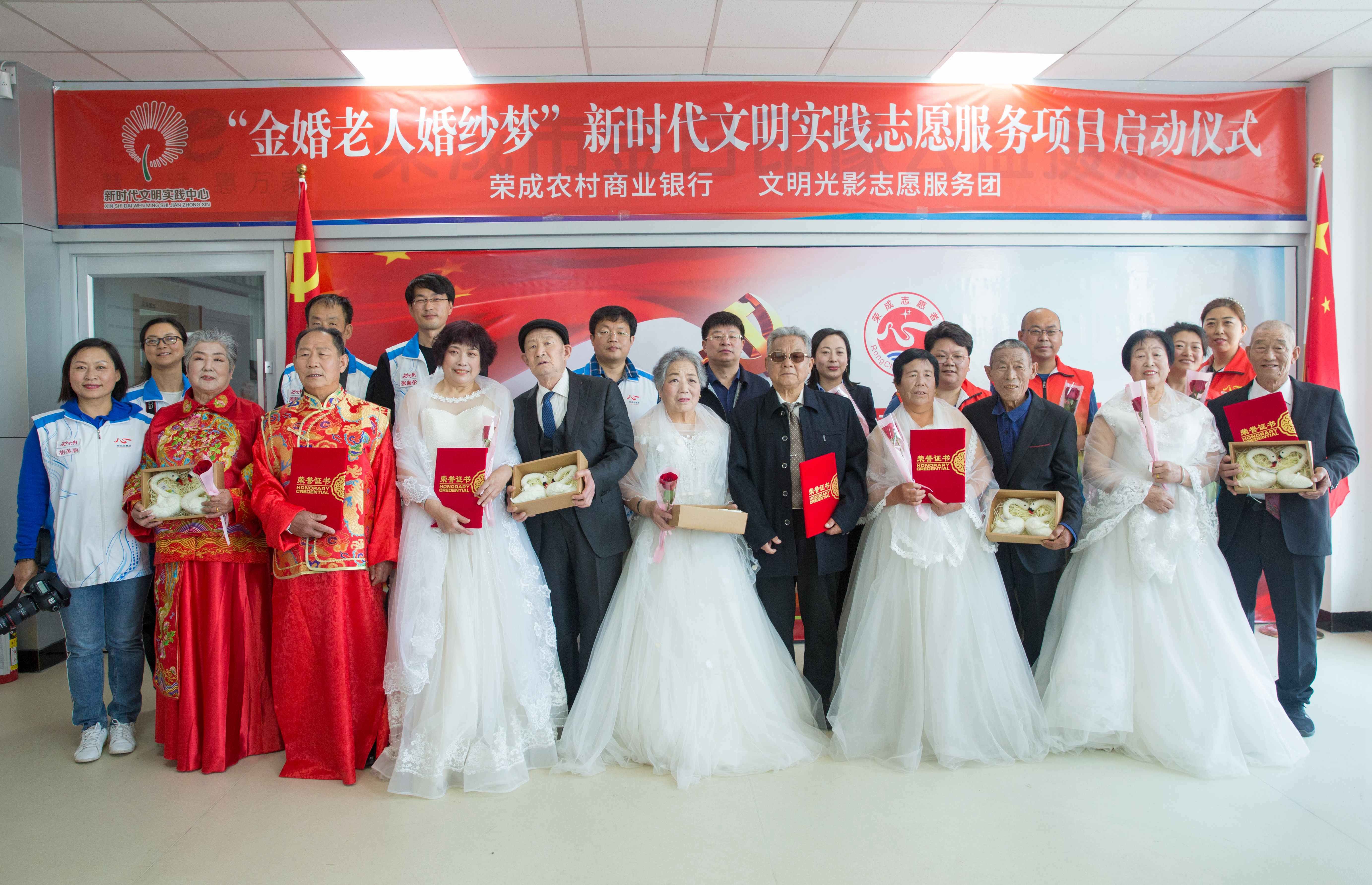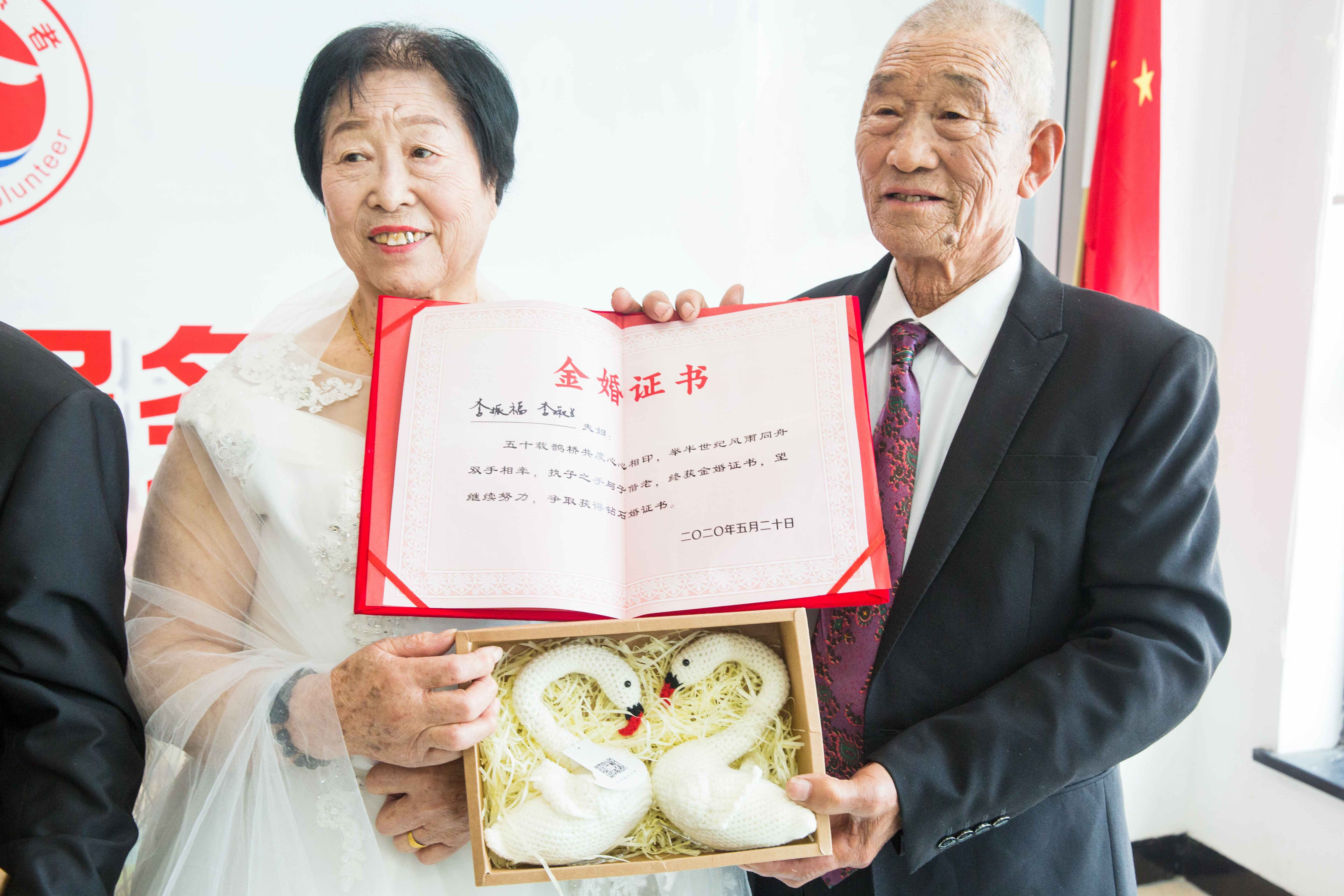 5月20日,2020年金婚老人婚纱梦新时代文明实践项目启动仪式,在农村商业银行志愿者之家举行,仪式上为五对金婚老人颁发了金婚老人证书,赠送了象征纯洁爱情的白色天鹅摆件,现场金婚老人还为2对520登记结婚的小夫妻讲述了他们的爱情故事,活动当天共有20多名文明光影志愿者参加。