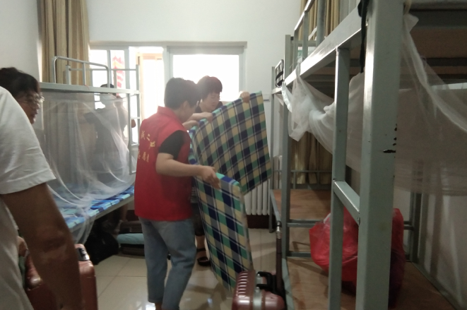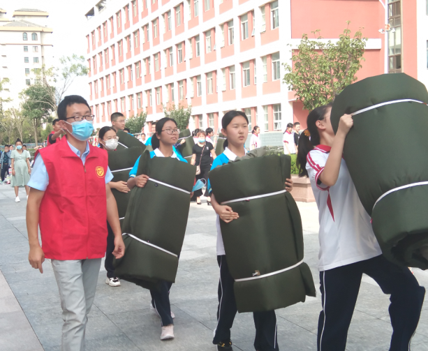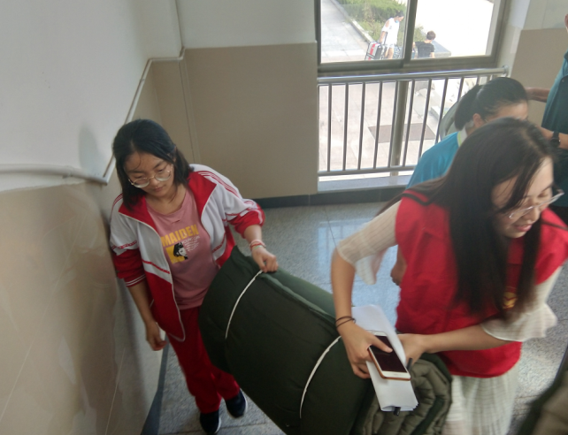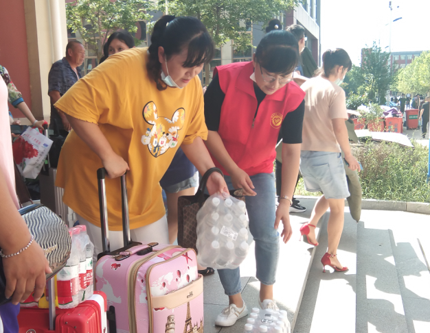 早晨6点30分,教师志愿者们早早来到学校迎接高一新生和家长。教师志愿者们在校园外疏导家长的车辆有序摆放,对入校的学生道路指引,带领新生认领床上用品,帮助新生搬运行李,进行宿舍内务指导和安全教育。在全体志愿者的协助下,到中午12点,全体新生顺利完成入学的所有工作。