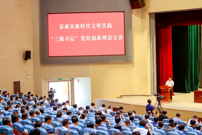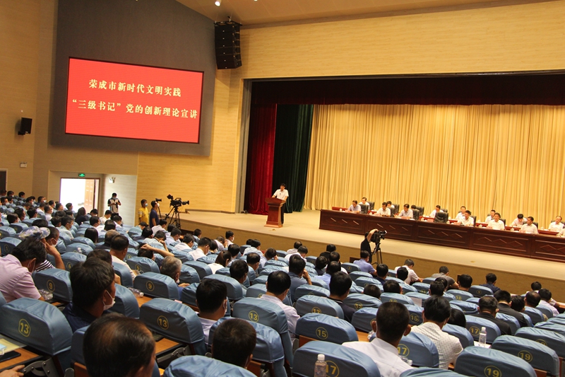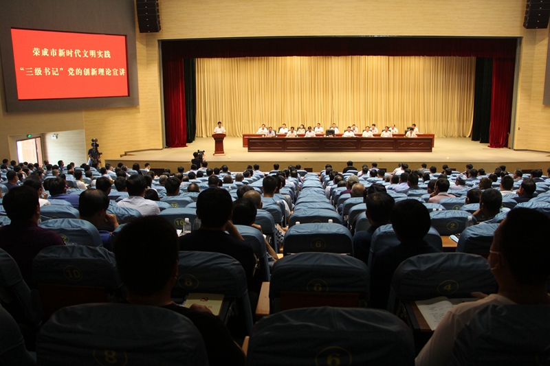 近年来,我市围绕“传播新思想、引领新风尚”总目标,紧扣“在哪讲、谁来讲、讲什么、讲多久”关键环节,积极探索“365”宣讲工作模式,创新“三级书记”带头宣讲制度,不断推动党的创新理论“飞入寻常百姓家”,让每项基层工作都能见思想、见精神。截至目前,已开展各类宣讲活动8000多场次,受益党员群众40多万人次,走出了一条具有时代特征、地方优势、行之有效的文明实践理论宣讲的“荣成路径”。