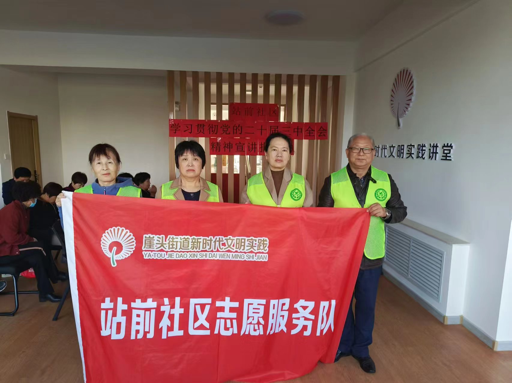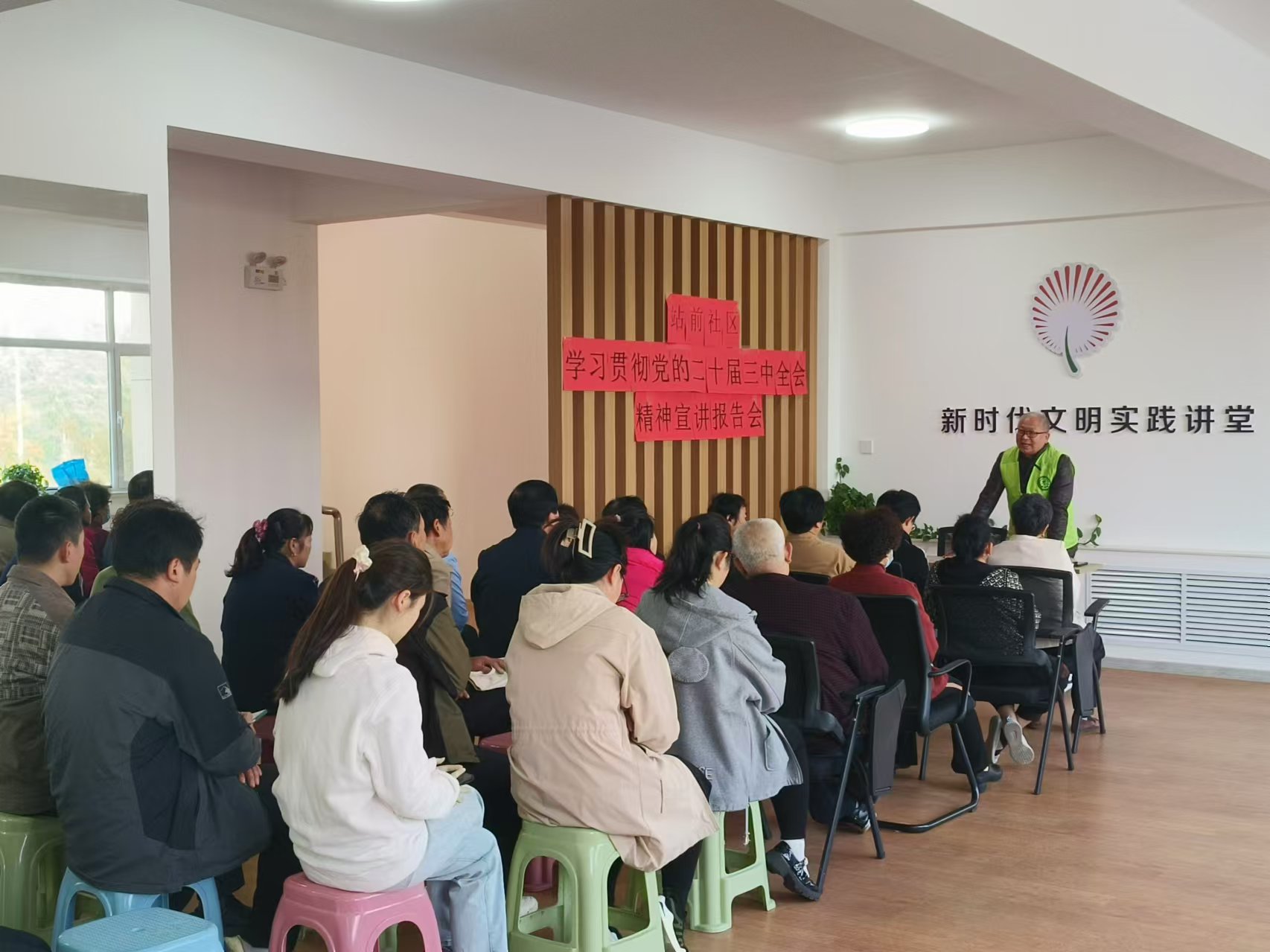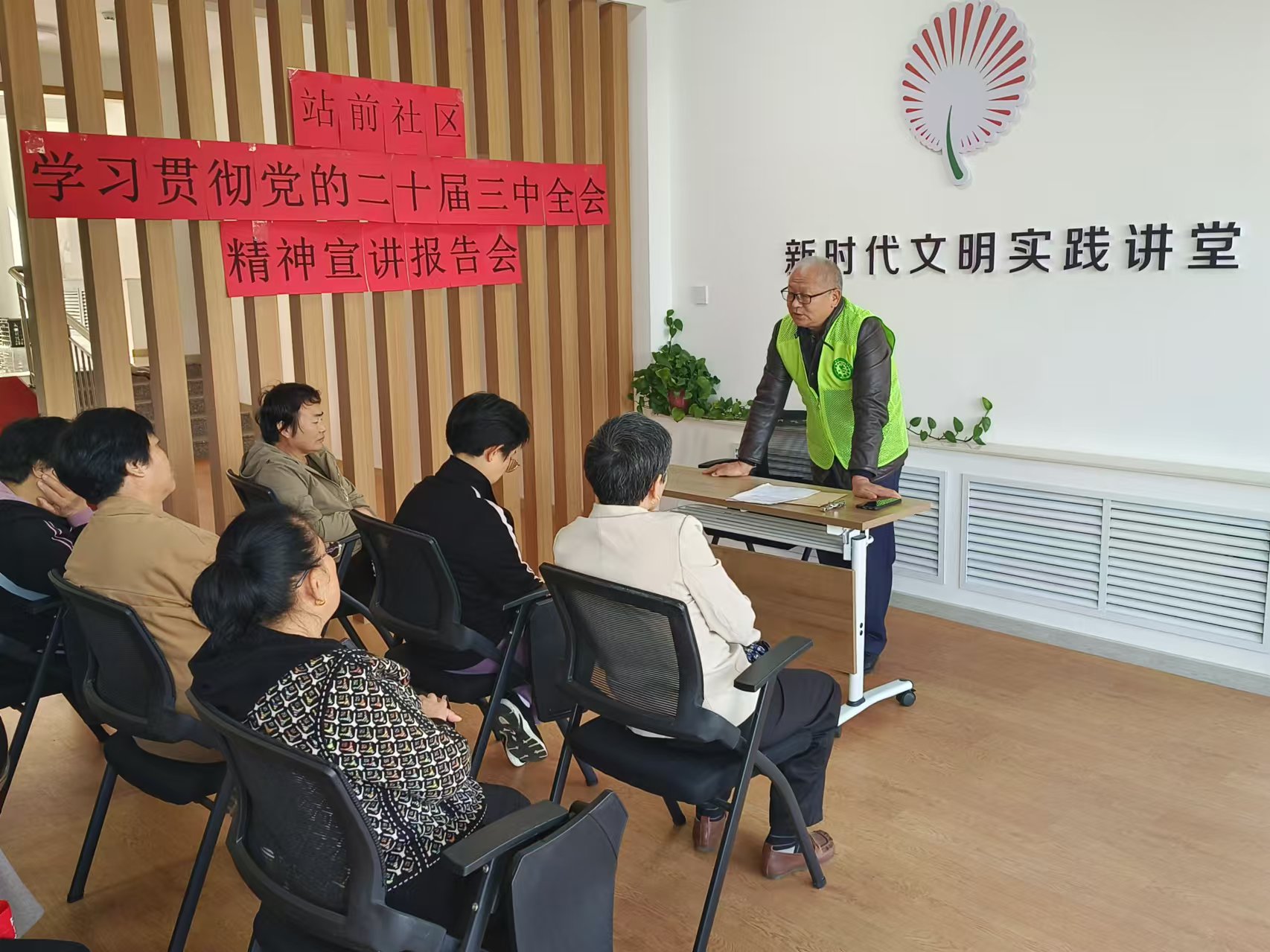 站前社区新时代文明实践站于2024年10月30日9:00-11:00邀请夕阳映万家志愿服务队的姚洪旅开展学习贯彻党的二十届三中全会精神宣讲报告会,准确把握党的二十届三中全会精神内涵,进一步统一思想、凝聚共识,提高社区工作人员为民服务的质量和水平,推动社区各项工作发展。